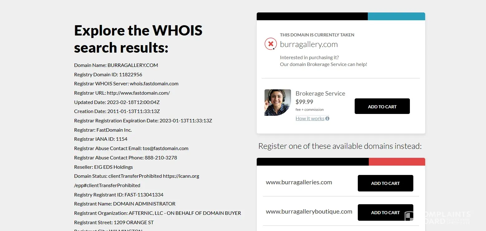 On Jan 24 I bought the lapsed domain name on behalf of our volunteer-run art gallery. I would normally buy from an Australian domain/hoster but bought from domain.com for an excessive price of $109.99 $US as the site was hosted in the USA. But I don't own it. It appears to be owned by a broker Dirk Cyr whose email address on domain.com goes nowhere