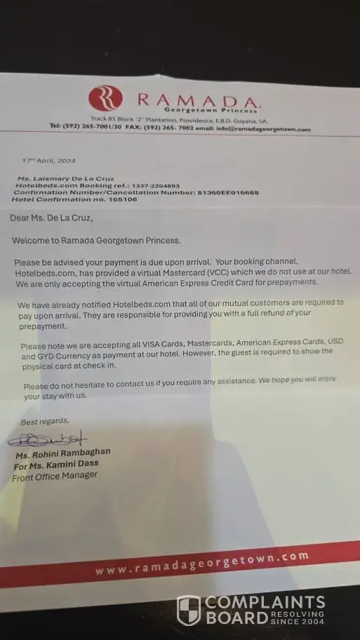 I pay online reservation for my friend and when she arrived at hotel RAMADA, they cancelled the reservation because i supposedly should have done with American Express card or visa if was online. So, my friend paid in cash and logically Hotel beds should have reimbursed that money, but it hasn't even been like that.