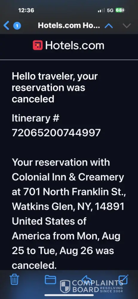 I reached out to Hotels.com on April 5th informing them of the illegitimate reservation and asked for a refund. They said they would resolve the situation in 72 hours. A week later, I had not heard from them and had not received a refund, so I contacted them again, repeating the entire claim. On April 12, they sent me a standard email stating they were unable to cancel my reservation and I would not be refunded.