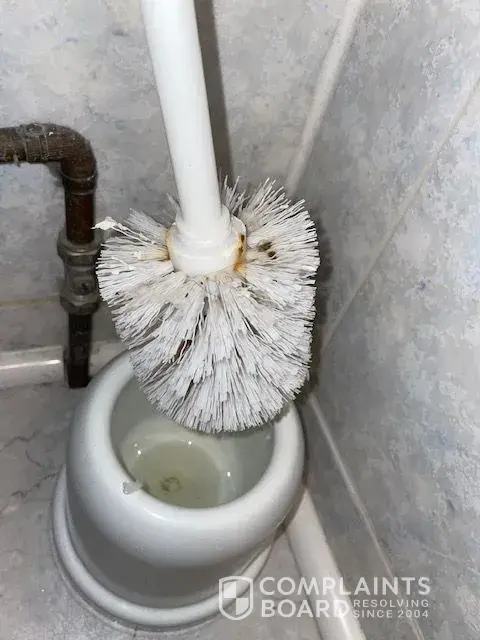 The toilet brush and drinking glass on the bathroom sink were beyond