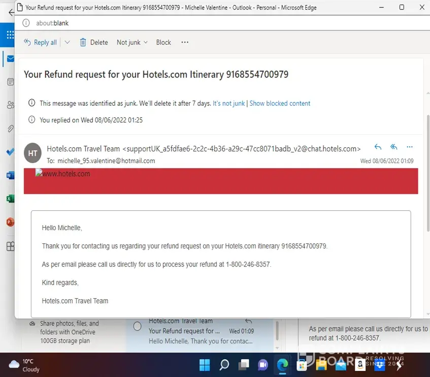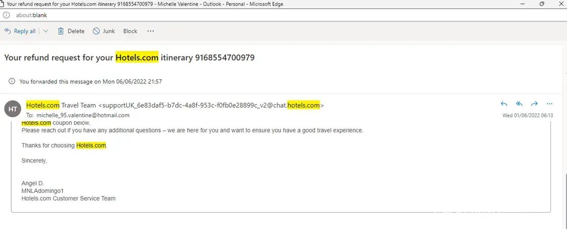 I am complaining due to the service I am currently receiving following a refund I am still waiting on. I have been getting emails from Hotels.com with a fake number to call back to process a refund. however, when I try to request this through the online chat, the agents I speak to advise me to wait further days for a refund to be processed. I have been advised by recent emails to send over relevant information, such as my post code and the date the payment was taken from my account and as such I have, I provided this information. but have not had any correspondence accept to call back on the following number: [protected] this number is unrecognisable it looks like an international number to me and won't let me dial out. I requested via email for an agent to call me back directly instead. and I am still not hearing anything but repeated emails stating ' Hello Michelle,