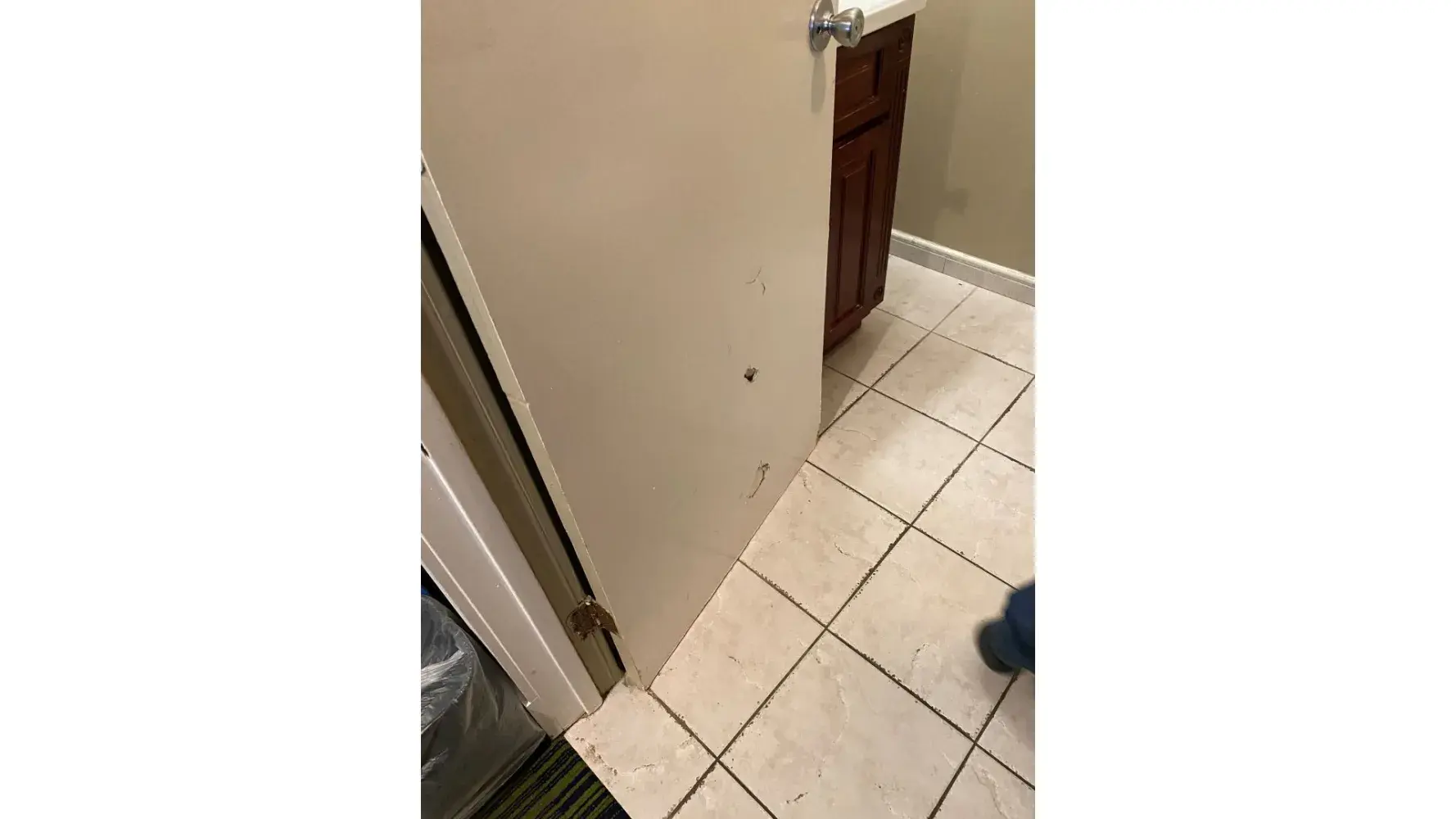 Holes in the internal door, pictures broken on the wall, dirty