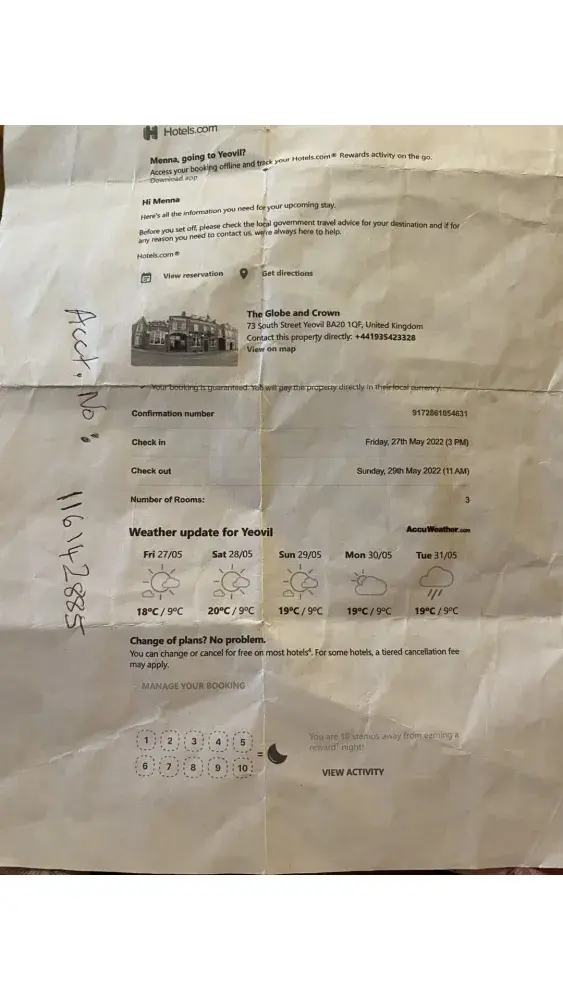 We arrived at the Globe and Crown in Yeovil on 27th May only to find that the hotel had been closed for some time. So we were left stranded on the holiday we had been looking forward too. I could not get any answer from the telephone number provided being +[protected] and have also been unable to contact any non-virtual representative at Hotels.com. When I type in my booking reference number being: [protected] your virtual help tells me this number can not be traced yet I have it all printed out on paper which I took with me.
