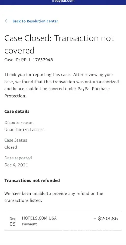 I disputed with PayPal and they denied the claim so I am contacting Hotels.com directly
