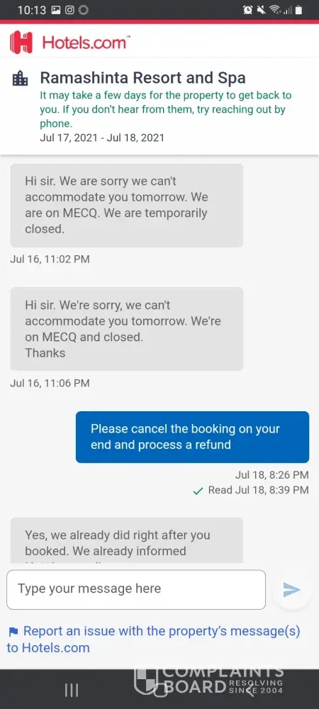 But Hotels.com messaged me that they could not reach the hotel to confirm the refund/cancellation.