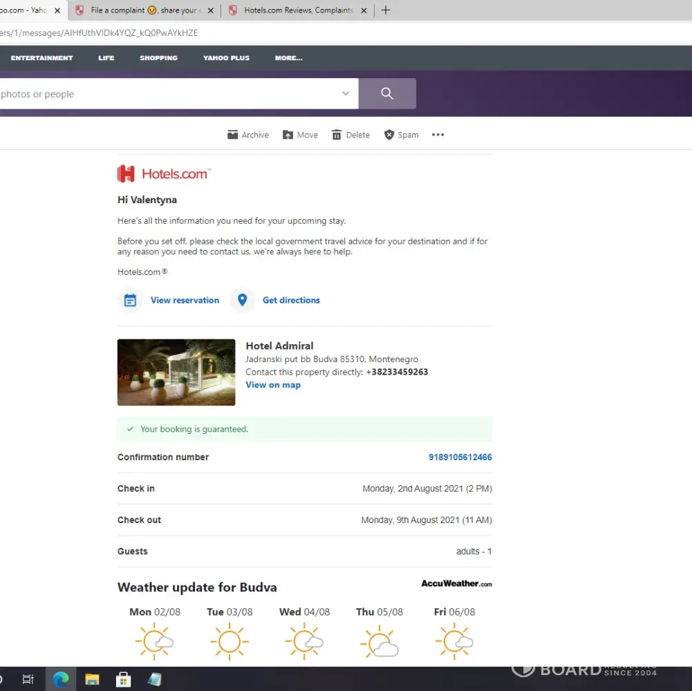 I booked a room in hotel Admiral in Budva Montenegro from August 2d till August 9th. Using hotels.com and got the confirmation.