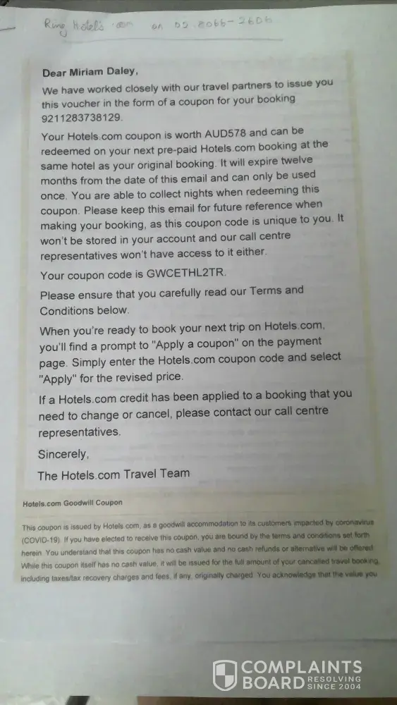 We had booked a hotel through Hotels.com for a stay in St Lucia in May 2020. Because of covid the island closed down and Hotels.com issued a voucher for the booking. I admit it was a non-redeemable booking as I had presumed that our travel insurance would cover any problems we may have had (of course it did not cover a pandemic). However we were provided with full refunds for our other bookings, given that they were not cancelled by us. In this instance though Hotels.com issued a voucher in the form of a coupon for the amount of AUD $578 but it can only be used at the same hotel as the original booking. I live in Australia and we are still not permitted to travel overseas and it is very unlikely that we will be able to get to the Caribbean before the voucher expires. I cannot understand why Booking.com and Airbnb can provide a refund but not Hotels.com. We would be happy for a voucher to use at any hotel (ie in Australia). The terms of reference provided with the voucher are very specific saying the coupon has no cash value and no cash refunds or alternatives will be offered and the terms cannot be changed .