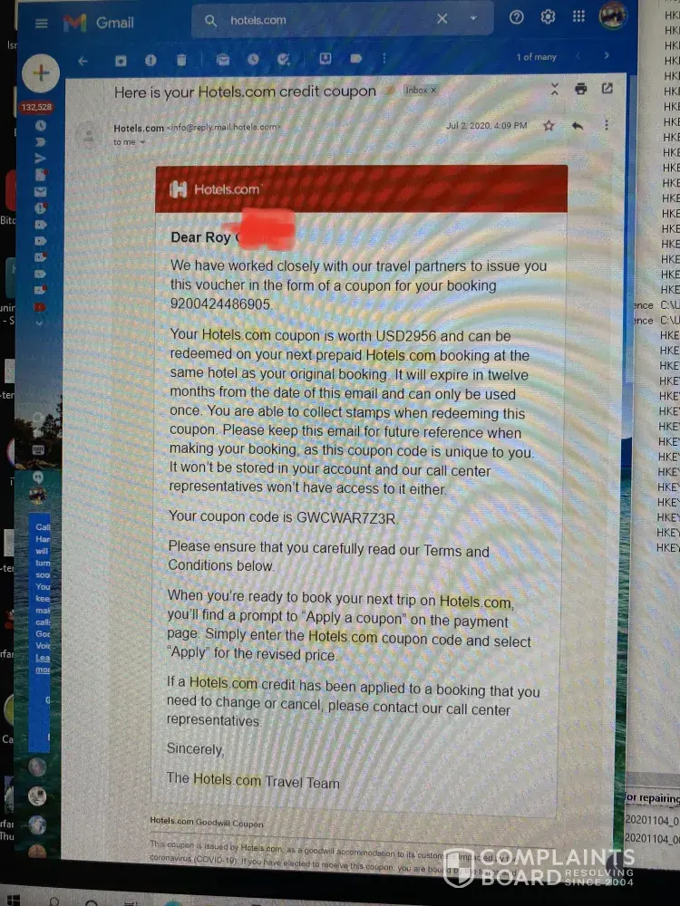 I have had several long chats via the website with customer service as well as at least one phone call (back when it was possible to get someone on the phone). I had a booking for last May, which was cancelled due to the national lockdown. Hotels.com was supposed to send me a voucher for that stay. I never saw that voucher. I contacted customer service over the Summer to inquire. They said it would take at least a month to cancel the previous voucher and submit a new one. Over a month later, I tried again. They said they same thing. Basically, every time I contact them, they tell me to look in my junk folder and insist it's there. It isn't. And they say they cannot send it any other way. It also does not show up on my account, so I have no reason to believe that they actually mean to give me a voucher.
