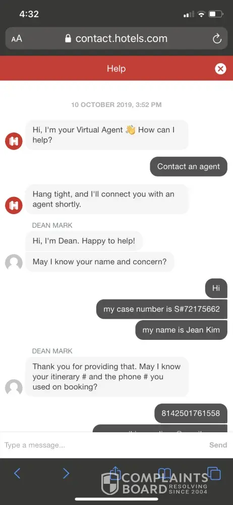 10/9: I spoke with Carl. He assured me he sent a request for a refund to the hotel and gave me a case # of [protected]. I explained my reason for cancelling as 35 counties in California were being warned by PG&E that power would be shut off due to fire dangers. I explained that I wasn't comfortable moving forward with the reservation due to the fire dangers facing California at that point and was trying to cancel the 4 dates and get a refund of over $800. I told him that if a refund wasn't possible, could I change my dates. I'm not sure what was included in his email to the hotel. He told me I should have an answer in 24-48 hours. I heard nothing. So, on 10/12/19 I called and spoke to Liam. He had zero record of my conversation with Carl, no case #. He was very difficult to understand due to his accent, but told me I should hear back in 24 hrs. I heard nothing. On 10/14/19 I called for the third time. I spoke with Josephine. She said she would make the request urgent and would only ask for a cancellation refund. On 10/16/19 I received an email from Hotels.com: