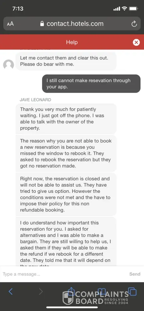 I made a reservation through hotels.com hotel and it got accidentally canceled. I chatted with several agents over this issue and said no problem checking in and told me I can get a refund for it if I make another exact same reservation on hotels.com. And I got a confirmation email from the hotel and then when I rechatted regarding this, agent said I need to wait for few hours to make another reservation for the same dates and this another reservation did not work even though I kept watching and trying to make reservation on the site.