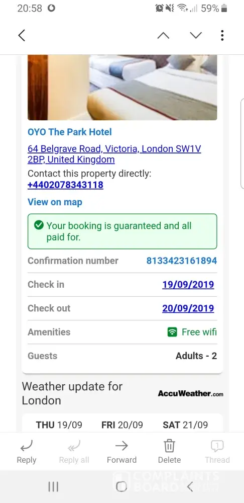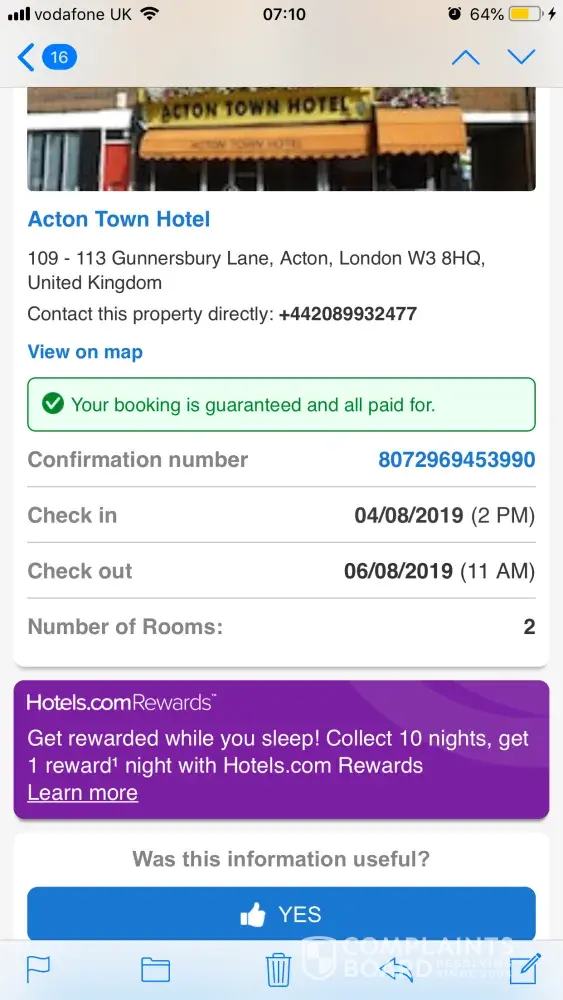 The issue that I have experienced was: I booked hotel (Acton town hotel) in London from 4-6 August 2019 via hotel.com.