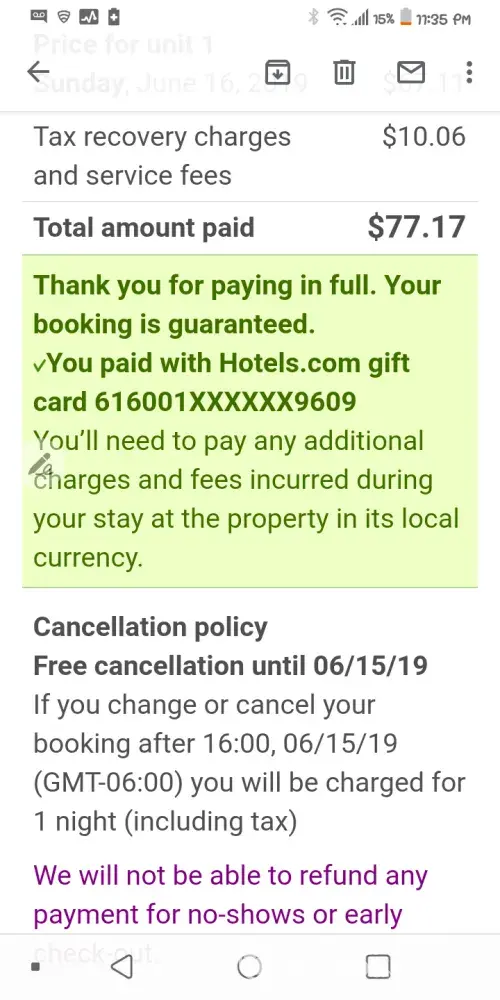 On April 28, 2019 I booked a 4 night stay (Check in June 27, check out July 1 2019) in Indianapolis for the Clarion hotel, through hotels.com. That confirmation number was: 8109671060197. I agreed to be charged $295.76 at the hotel.