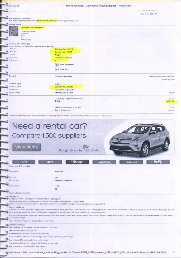 1. I had done the hotel booking for our Budapest visit through Hotels.Com, for Continental Hotel Budapest. As per Booking [protected] (attached separately as Book1), I had booked for 4 nights and 3 rooms from April 27, 2018 to May 1, 2018., with the total payment of $2, 275.32. Since, 2 of our members, Mr & Mrs Satish Sheth, were reaching Budapest on April 26, 2018, I had done separate Booking [protected] (attached separately as Book2-Original) for 1 night and 1 room for Mr & Mrs Satish Sheth, with the total payment of $223.27. However, by oversight, the dates used for the booking were May 26, 2018 to May 27, 2018 instead of April 26, 2018 to April 27, 2018.