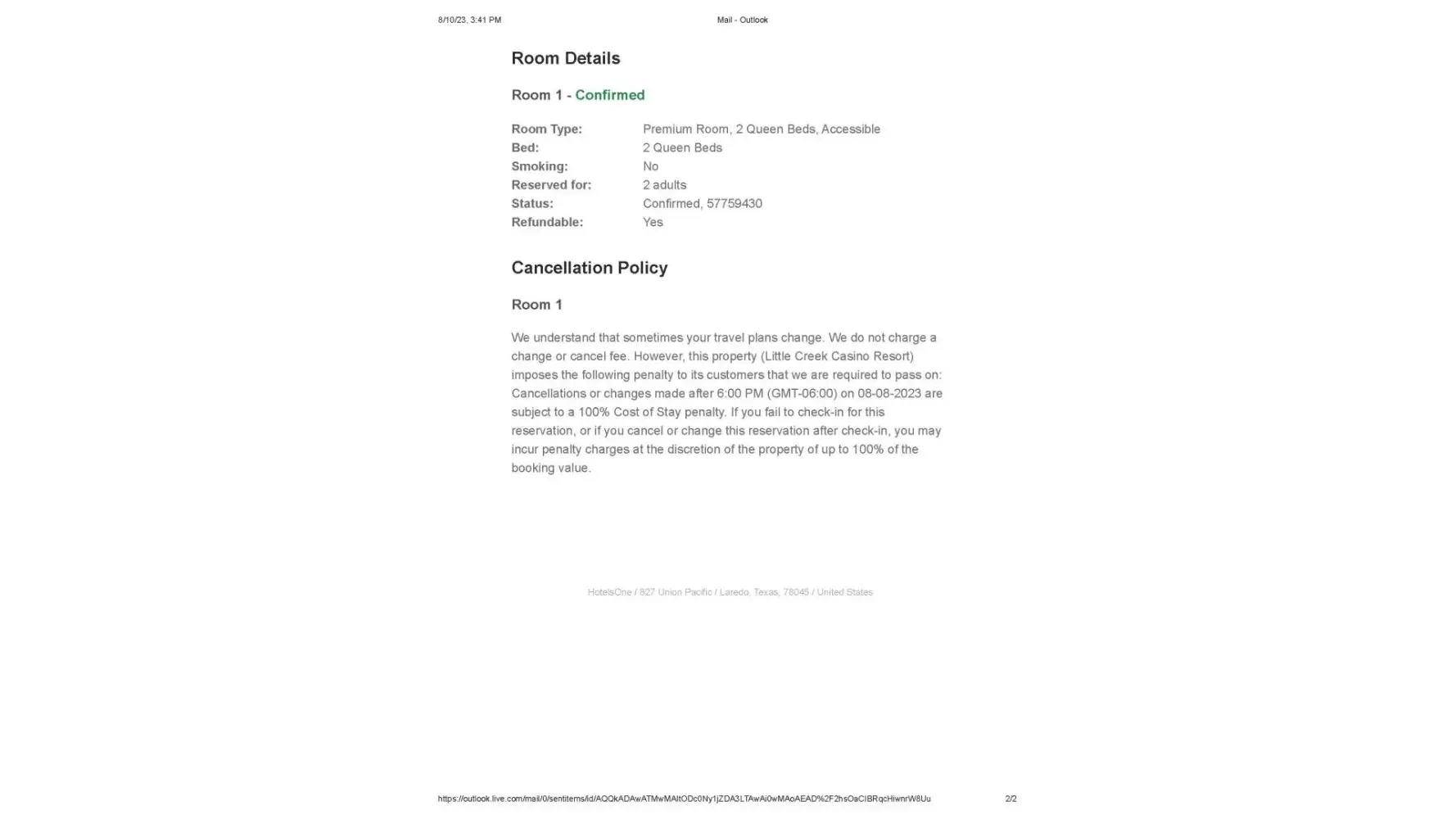 We made a reservation on July 29,2023 at Little Creek Hotel and Casino in Shelton WA. After we made the reservation we realized it was not made through the Hotel, because they would not honor our complimentary stay. We immediately cancelled the reservation with and received a cancellation confirmation email. However, they did not refund the payment and did not notify the hotel that reservation was cancelled. So we paid $233.57 for a room we did not sleep in. When we called Expedia, we were transferred to many offices (all overseas) and they kept saying the could not help. The fact that Expedia claims to be this great company, and honor cancellations is a joke. We are out $233,57 dollars because they have a website setup that "looks" like the hotels, but in fact it is not. And after we drove to the hotel and talked the manager, she new about the problem and was sorry we were tricked. We cancelled the reservation on the same day, and the confirmation is attached.