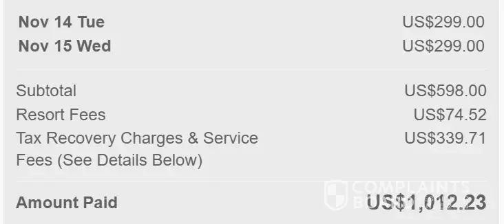 then I see my email sent me the confirmation from [protected]@hotelvalues.com , it shows the total price different than the one I saw , it adds on Tax Recovery Charges & Services US$178.03