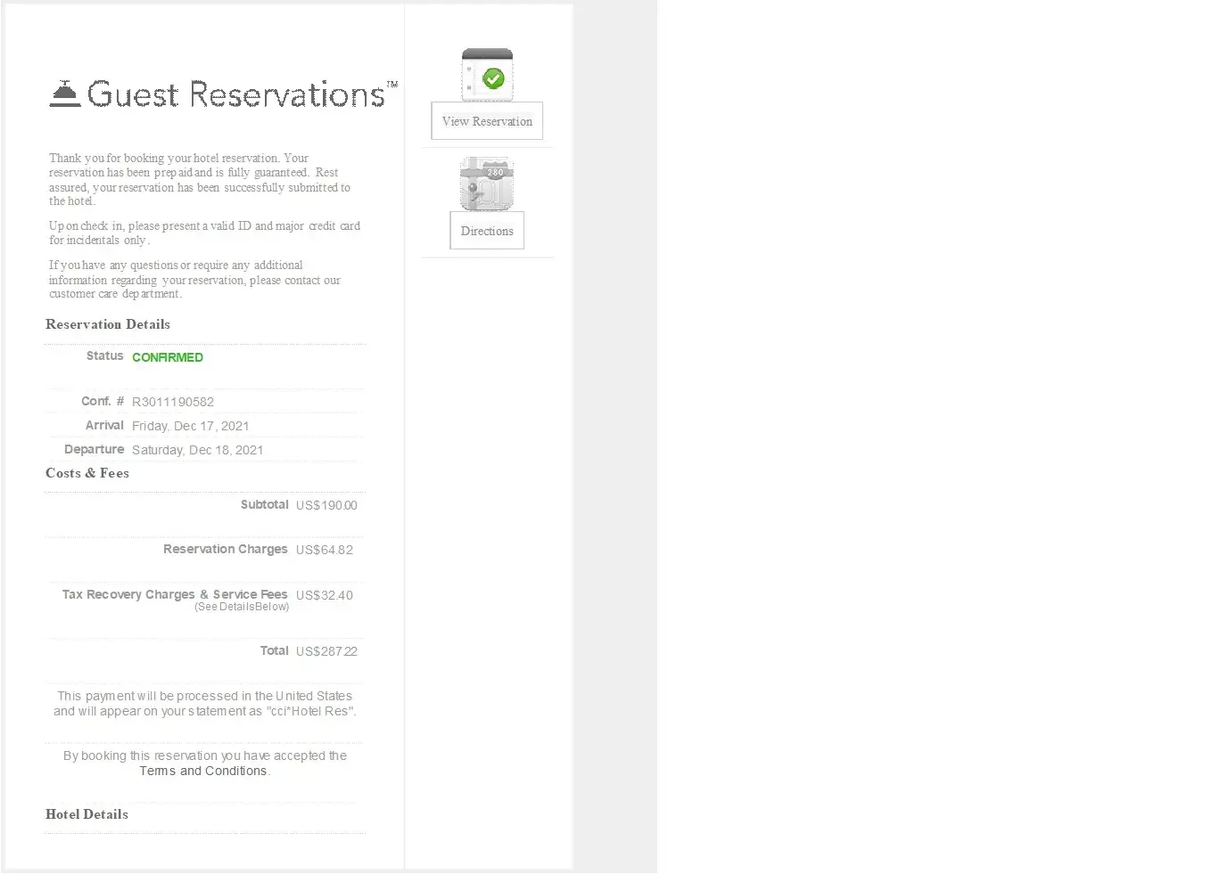 I made a hotel reservation under the website for drury hotels. Apparently a website called guestreservations.com captured my activity and advertised $126 per night for a queen room. I reserved 2 rooms for one night. They did not show final bill until I confirmed, then emailed me the confirmed reservation for $690.50! I talked to them for two hours and sent them a screenshot of the price quoted on guestreservations.com and they told me drury inn would only cancel one room. I talked to drury inn and they said they had not been contacted by this company and would gladly allow them to cancel the reservation with no penalty. I called the initial reservation company back and they would not let me speak to a manager, owner, etc. AND they never took off one night charge! A charge of $690.50 appears on my bill as cci*Hotel Res.