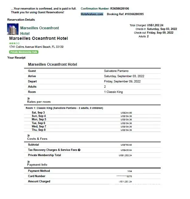 In August 2022 I called a number which I thought to be the Marseille Hotel Miami Beach Reservations department, made two reservations for my clients R3658619465 AND R3658628106 for $1202.24 each, I gave the IATA number of my host agency [protected] (Palm Coast Travel/Oasis Travel Network) to meae sure I get my commission and the person who took the reservation and the payments over the phone read it back to me and said that I would get my commission. 6 months have passed, I call the Hotel asking for my commission, they say it's not my booking. HotelValues.com tricked me into believing that I was talking to the real hotel. They stole my commissions.