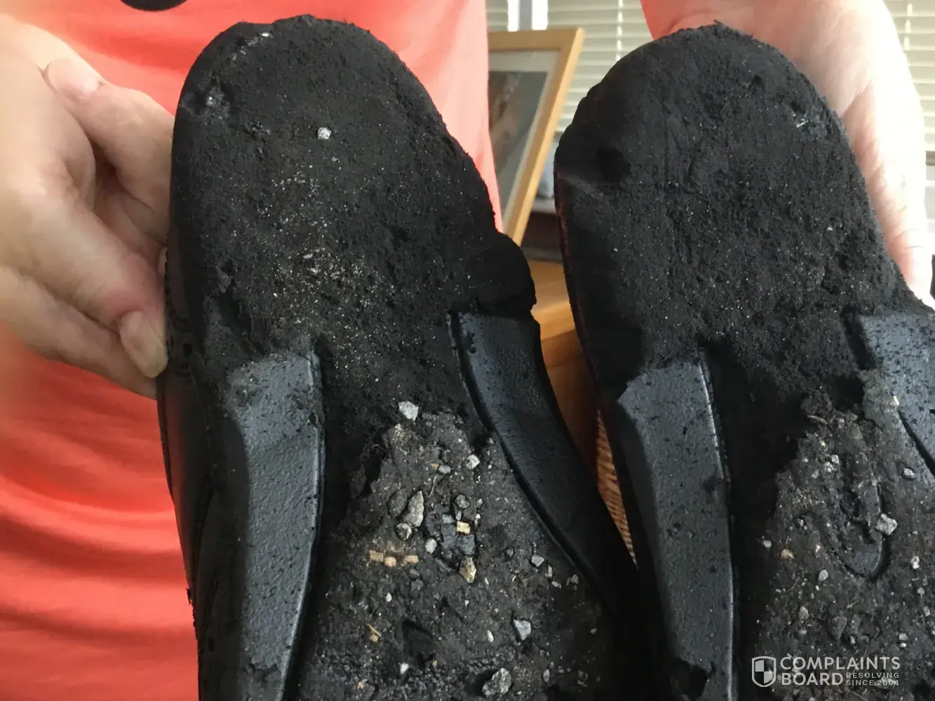 Exactly the same experience. Between us my husband and I have had the soles of six pairs of Hotter shoes disintegrating. The shoes were quite old but the uppers were in excellent condition. It was embarrassing when one pair shed black stuff on the carpet of a good hotel.