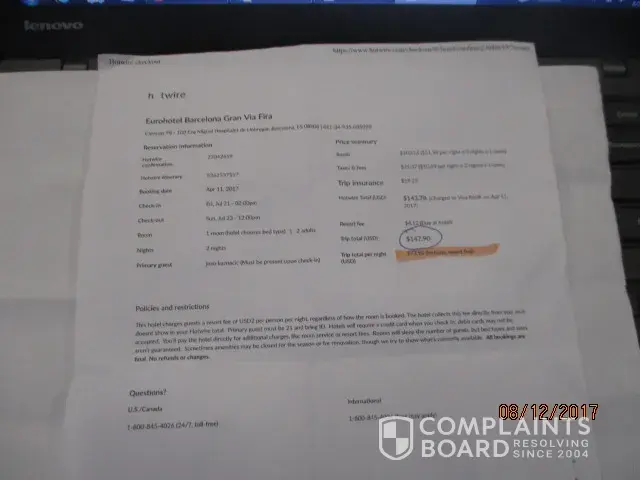>>>> FORMAL CLAIM FOR REIMBURSEMENT We booked a Hotel with your company for the 26th of May in Toronto (Pinacle Suites located in 5 Hanna Street). In the confirmation response it was clearly said that we did not needed further confirmation and we could arrive at anytime that day. My credit card was charged with the complete fee plus taxes. Thanks! Your reservation is confirmed. No need to call to reconfirm. Pinnacle Suites - Trendy 2-Story Loft, Toronto May 26, 2017 - May 27, 2017 Check-in and Check-out Check-in time 4:00 PM Check-out time 11:00 AM Check-in policies Check-in time starts at 4:00 PM Minimum check-in age is 18 Your room/unit will be guaranteed for late arrival. When we arrived to the Hotel, tired after a long journey, with our suitcases, expecting to have a pleasant stay, we were confronted with the unpleasant surprise that there was not record of a reservation in our name and the person in the front desk told us that this location was not a Hotel and the owners were not allowed to rent their units. This is misleading information, since in your page the place is advertised as a HOTEL. Pinnacle Suites - Trendy 2-Story Loft 5 Hanna Avenue, Toronto, ON, M6K 3E7 Canada View hotel Map and directions We called your company right away and did not have a satisfactory response from your employee or call center in charge, and there was no alternative solution given. It was around 10 pm and we stayed there for about an hour trying to solve the situation. At the end, we were forced to leave and ended sleeping in the floor in the apartment of a relative, since we are seniors, it was almost midnight and there was no hotels with space in the area. I am an attorney and know our consumer rights were violated. In this moment I do not have the intention to present a case against your company or claim for punitive damages and other compensations, unless you continue to ignore our valid complains. The least effect I expected from HOTWIRE was to receive your apologies plus a complete reimbursement of the amount charged to my credit card, since we could not use the contracted unit due to your fault, not ours.
