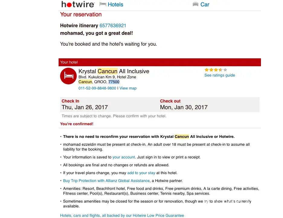 I have booked a reservation"Krystal Cancun All Inclusive" on Monday, October 10, 2016 10:14 PM. This should include the following amenities:
