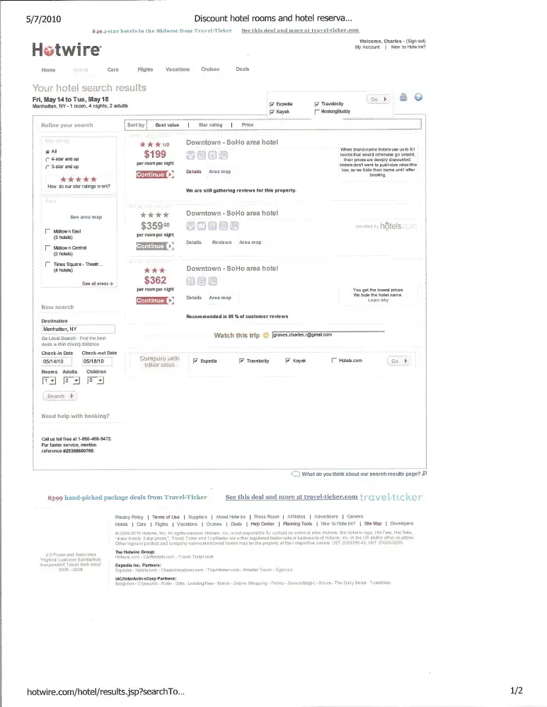 On May 5, 2010 I used Hotwire.com to try to book a hotel in Manhattan, NY. The Hotwire hotel search for the area revealed 3-1/2 star hotels listed in Downtown - SoHo area. The site revealed a map showing lower Manhattan which included SoHo.