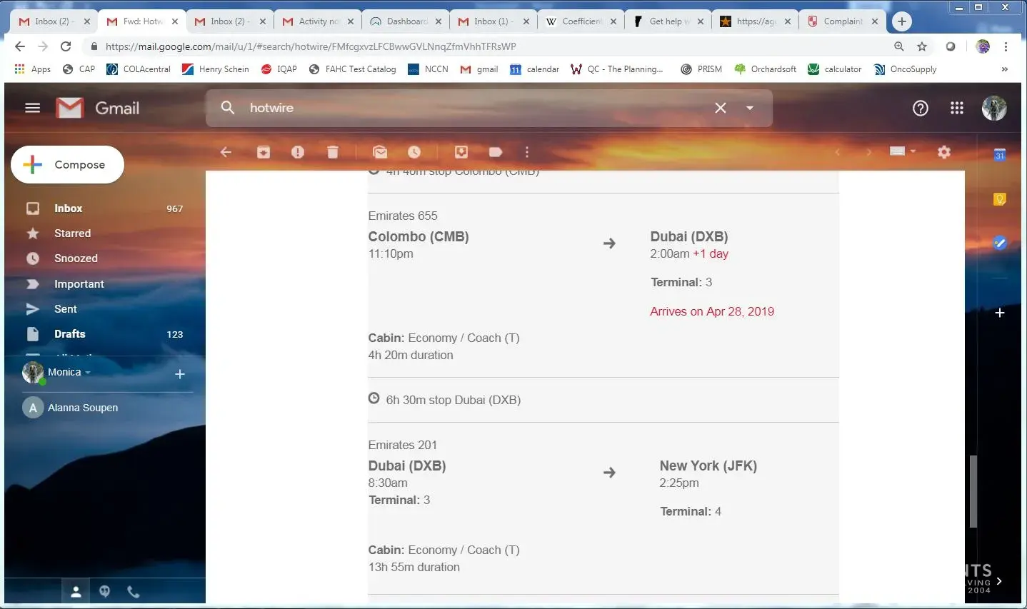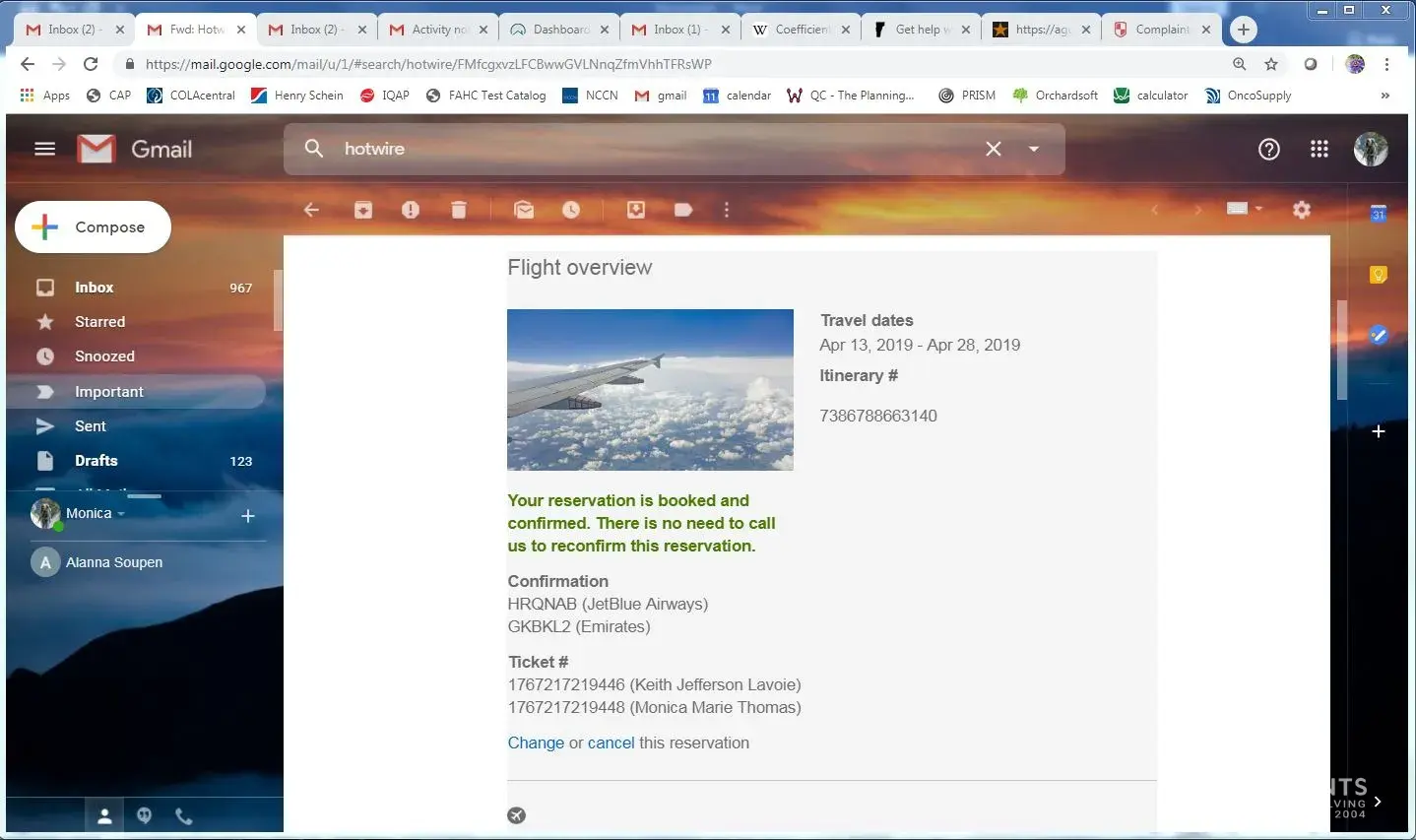 I have an ongoing case under itinerary # [protected]. Phone # associated with the booking is [protected]. Keith Lavoie and Monica Thomas are the customers involved. Last meaningful contact was with Hotwire supervisor Sheryl on 5/17/19.