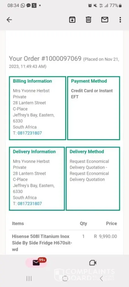 Promises to deliver anywhere in South Africa.. Excuses upon excuses.. Emails sent back and forth on how the area is an outlying area and they cannot deliver but you terms and conditions on delivery and promises state otherwise.. Incompetent and unprofessional... Still waiting... 5-7 working days sinse 25 Nov 2022 and still waiting.. Fully paid in cash.. Still waiting...