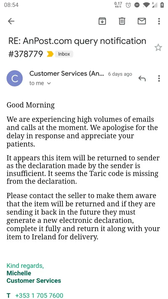 I was told by my local post office that the items where sent back due to the seller putting insufficient information and it was sent back to them.