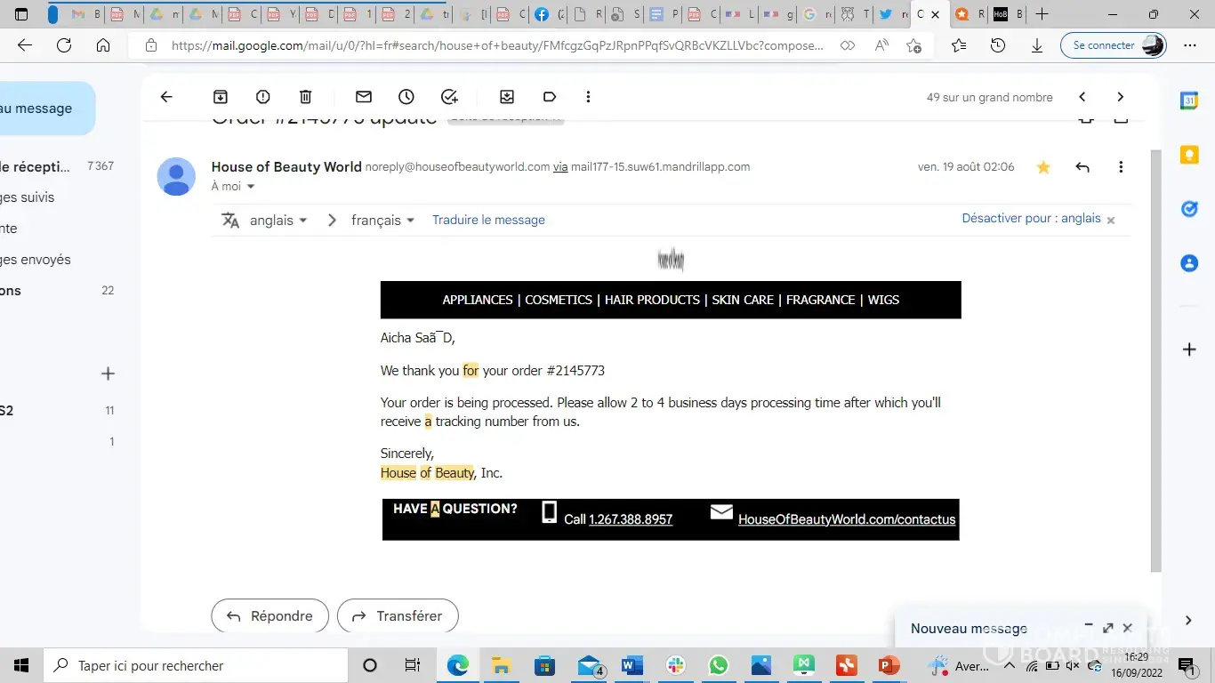 On August 15, 2022, I placed an order on the "House of Beauty.com" site for an item (order number W-2145773) that cost me approximately $181.75 (183.80 euros).