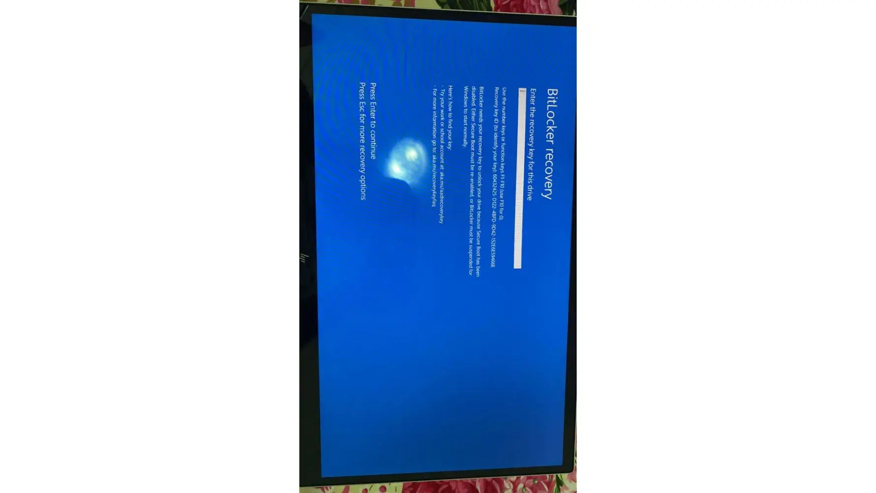 Unable to open my laptop, its asking for bitlocker recovery key