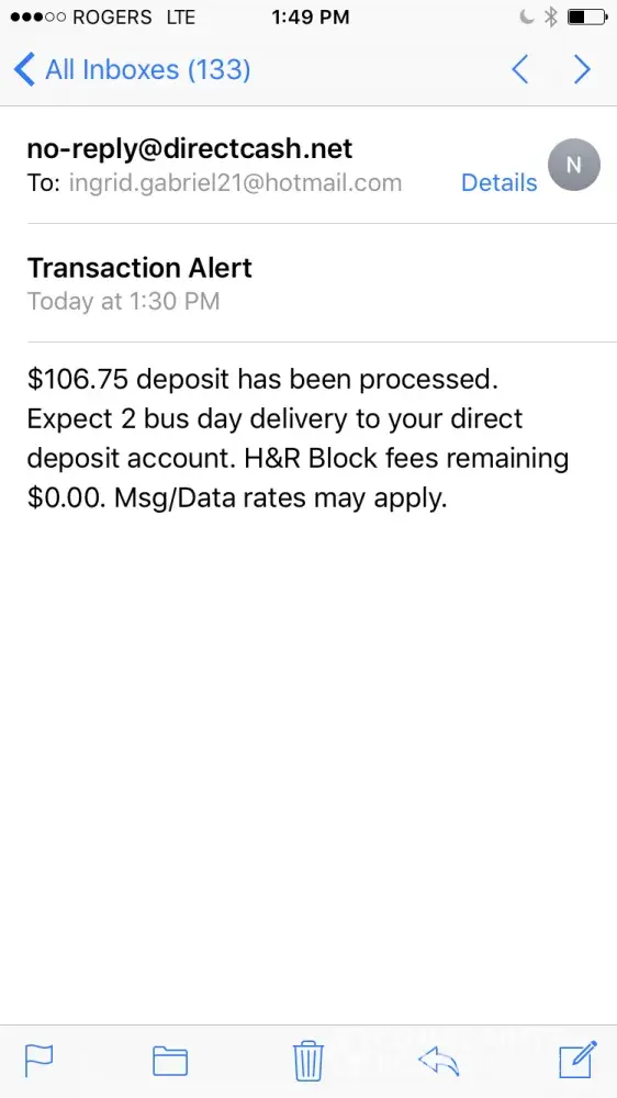 Hi, for years I've been filing my with H&R Block, and never had any type of issues, but in march-April I decided to go get my taxes done as usual and, the girl that was helping me was new and didn't really know what she was doing or saying but I have her a chance, take in I had to pay 114$ to get my taxes done, she didn't even want me to cash a check she wanted me to get my refund put in my account which I later agreed, but then comes my gst refund day arrives and I have nothing in my account, I'm with TD, and they usually deposit by 305am, I received an email from [protected]@directcash.net, saying ; (106.75 deposit has been processed, expect 2 bus Day delivery to your direct deposit account, H&R fees remaining 0.00$. Msg/Data rates may apply.).. later that day I received the gst, now were July 5th and I still didn't get anything, got the same email, stating I will receive my $$ in two bus days, I never signed up for this, it's very rude and disrespectful that I have to wait an extra day or two for something that's supposed to be deposited at 3am, I would love to escalate this to higher level, it's unacceptable, and to think I recommended this company to friends and family, worst idea ever, I want this issue resolved quick, so this won't happen to my nxt gst payment, and I already know o July 10th I will not get my $$ on time, thank you for reading, I am waiting for your response..