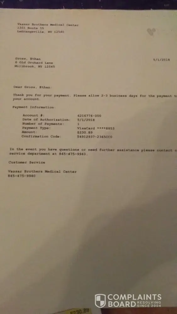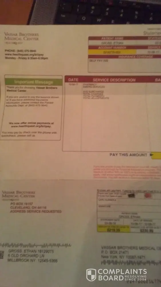 Vassar admitted to their error in producing an emergency health care services for my son Ethan Gross in the amount of $707.00 for $219.35 of services. A new bill was produced for the amount of $219.35 and this was paid in full. The account number is [protected] and the new statement date is 03/28/10.
