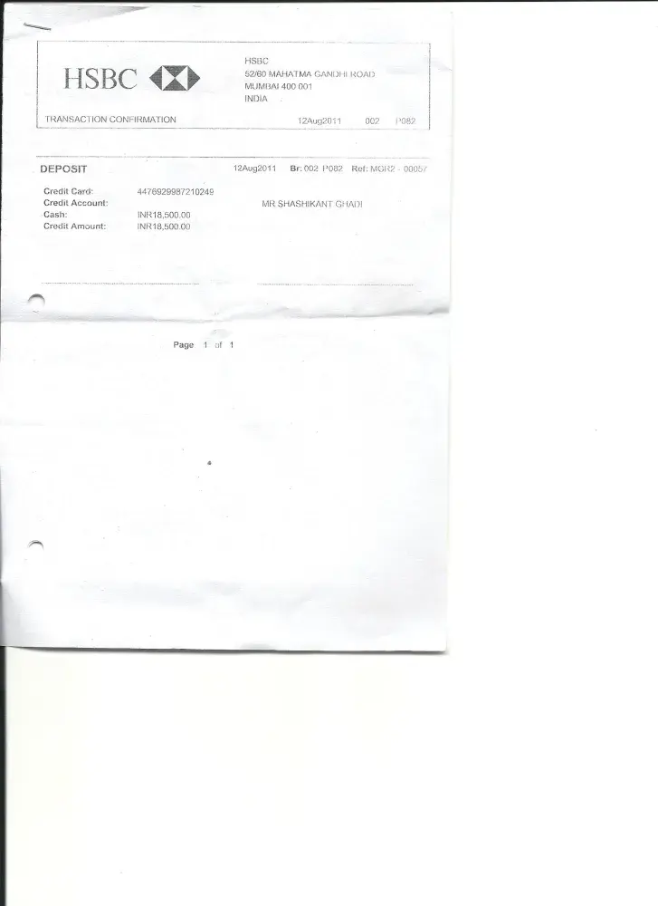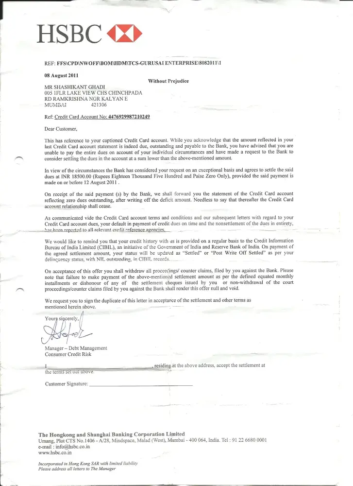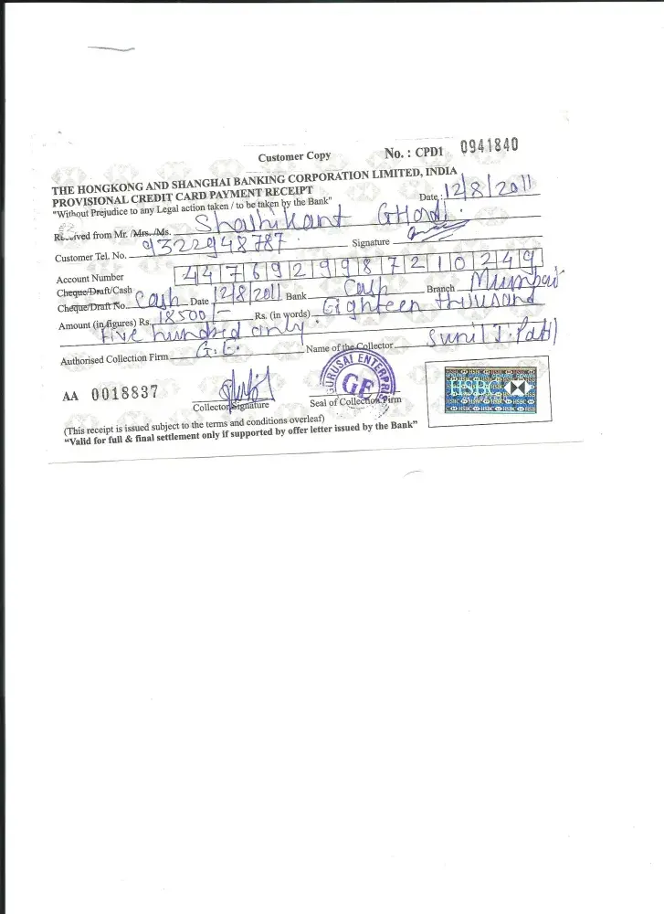 I Mr. Shashikant M. Ghadi, holding HSBC Credit Card A/c No: [protected]. This is to inform you that I have already done the settlement with full & final payment to the HSBC Bank. The settlement was done through your collection agency GURUSAI ENTERPRISES. The collection person Name: Mr. Sunil Patil & his senior person who had come at the time of settlement with the letter was Mr. Nitin. I have also received the settlement letter Ref: FFSCPDNWOFFBOMHDMTCS-GURUSAI ENTERPRISE80820111 DTD. 08 AUGUST, 2011.