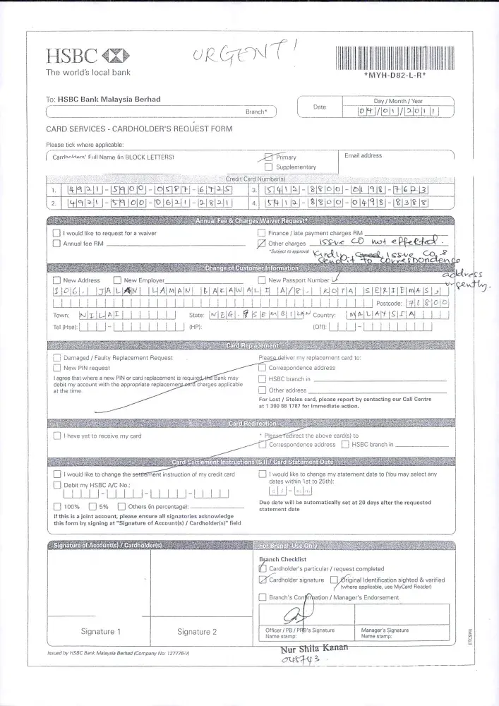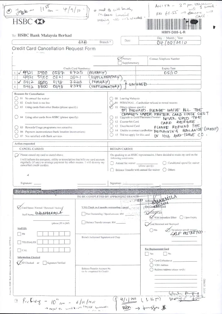 I cancelled my HSBC credit card in August 2010 by filling in cancellation card in KL. Apparently, I still money in the account which I paid extra in the earlier transaction. According to the HSBC staff that I dealt with at the time, I should receive back the money in 2, 3 weeks.