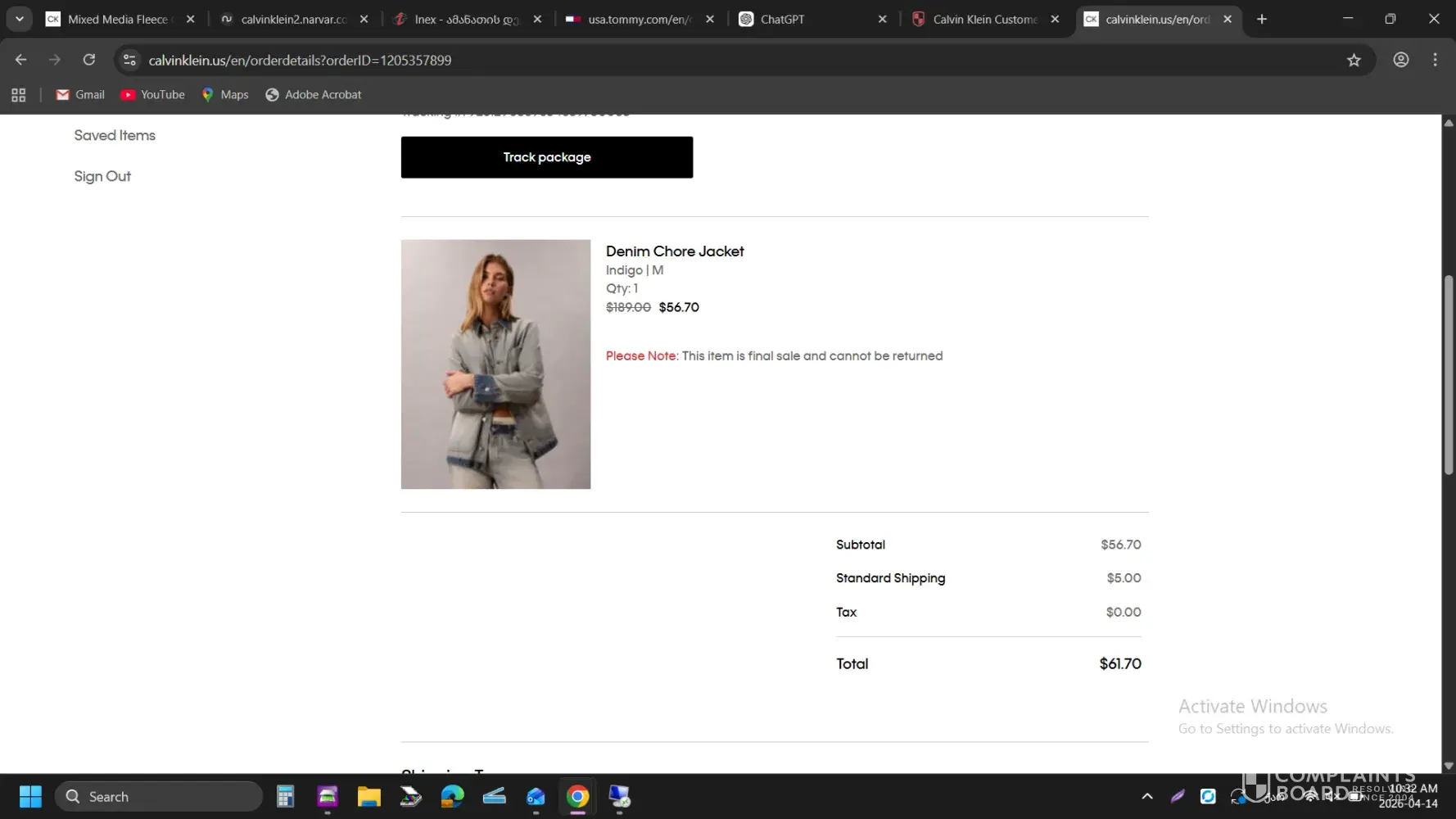 I purchased a denim jacket from your website (https://www.calvinklein.us/en). My order number is Order #1205357899.