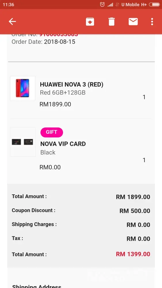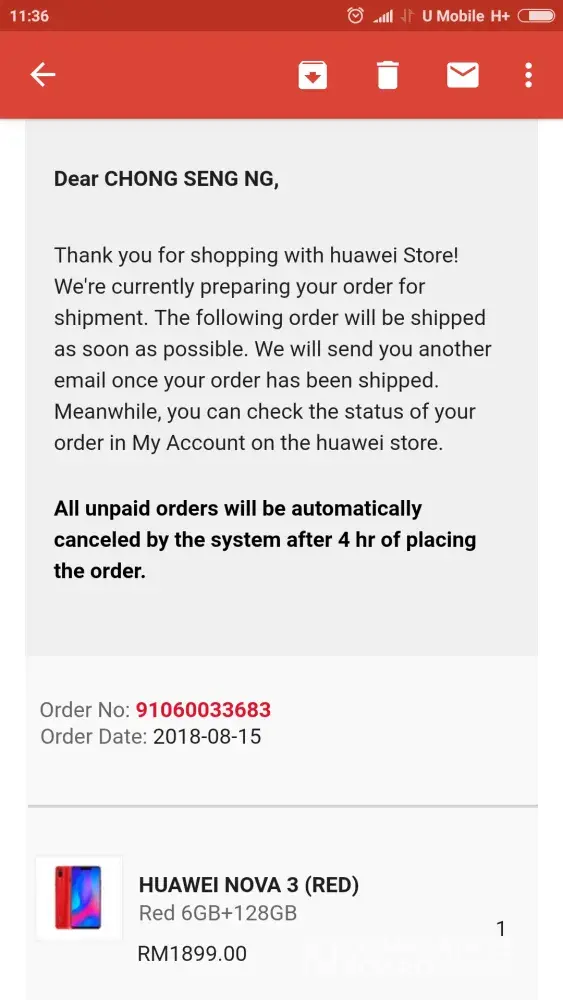 On 15 August 2018, at 9:00am I made a purchase of Huawei Nova 3 (Red) using the RM500 which I have won in conjunction with AirAsia and Huawei. Towards the end of my transaction, I was led to a blank page. Being concerned, I made a call to Huawei customer service hotline and spoken by the staff named Ching. Ching told me clearly that my order was approved and even gave me my order number that the mobile phone will be delivered within 2-3 business days. I also received a confirmation email that my order is being processed and the mobile phone will be delivered under my cousin's name within the time frame mentioned.