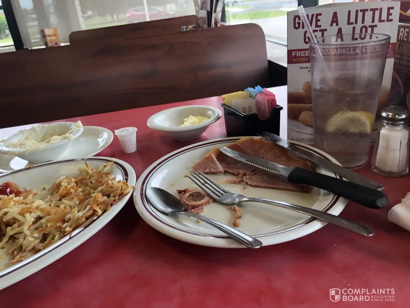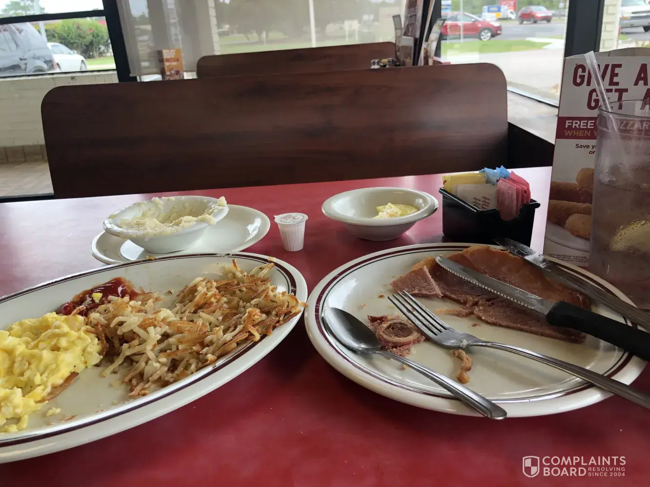 Early this morning (7/28/19) my family and I went to grab some food. When we pull into the parking lot I notice an employee smoking outside, we get up to the door and there's at least 10 ppl hanging out inside the doorway which never moved out of our way to walk through. First thing we noticed when entering (after the crowd of people just "chilling") is that the store is very nasty and looks like it has NEVER had a deep cleaning. We order 2 cups of coffee and literally had one spilled on us. Our sever never said sorry or offered napkins other than bringing our silverware. We had 3 people in our group and we ordered... 2 chopped steak dinner with no mushrooms, mash with gravy, fries, and the other person ordered the NEW bacon & mash southern fried chicken with green beans. We then notice the employee (Andrew) that was outside smoking has come in to prepare our food without washing his hands or putting on a hairnet which is hair was very long and nappy. We get our food and have mushrooms on our steak, no gravy on mash, fries was ice cold, he had mash on top of his fried chicken, barely any gravy, no bacon, his chicken was hard as a rock, and ALL of our Texas toast was soft with a glob of unmelted butter on top. Another server (Jamie) took all of our plates and made them right which she apologized a few times for. The girl Jamie said she had been there since that morning because the manager wouldn't answer the phone to send nobody else in which there is no excuse for! Someone needs to learn to run a place before it's shut down because a lot of people in this small town use to love going there but not anymore. The whole place was unprofessional and a complete mess! Had I not been starving we would have left right away and never paid for anything! GET IT TOGETHER BECAUSE THE MANAGER DOESNT CARE!