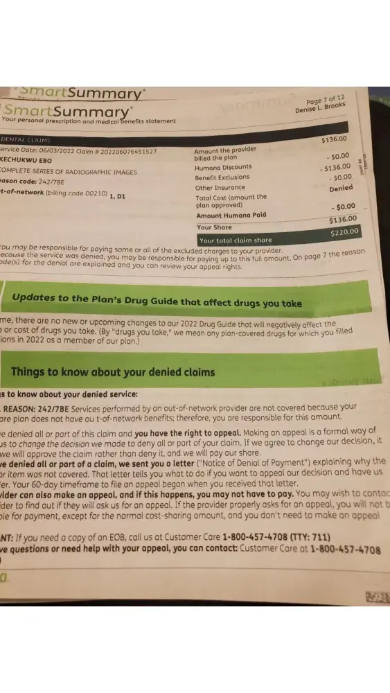 I have talked with many representatives from HUMANA on several occasions one woman while I was ordering over the Counter supplies was a very nasty woman. I reported it and nothing happened. I have spoke with several representatives at HUMANA and I know there is a remedy for these bills that was sent to me and they mean nothing. I have a total of $4,000.00 per year from the HUMANA policy saying in Network! I don’t know who told them that my dentist is out of Network. Please show me full disclosure of the premiums paid and to whom for what. This is a travesty and I am not an Employee of HUMANA, or a dependent of HUMANA. Your CORPORATION has made more credit from my only Policy in one year that I can shake a stick at. Please send me information for the Policy how much is on Ledger and off Ledger for this Trust Cestui Que Vie DENISE LAQUA BROOKS. What it has paid for and what in the future it is going to pay for.