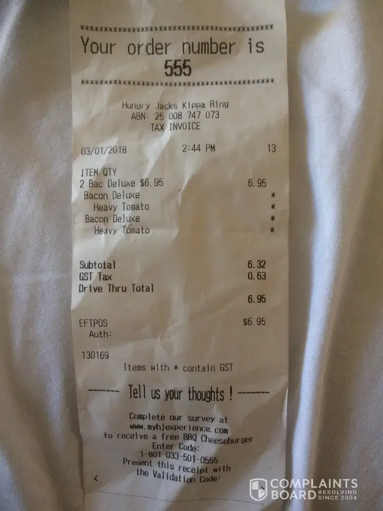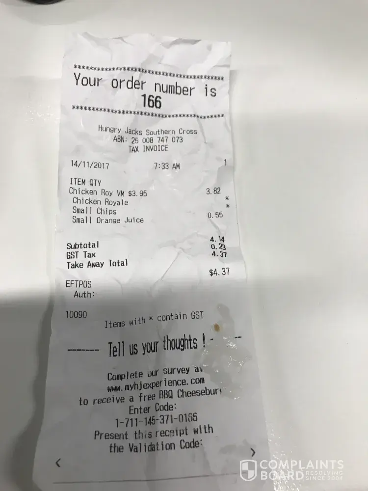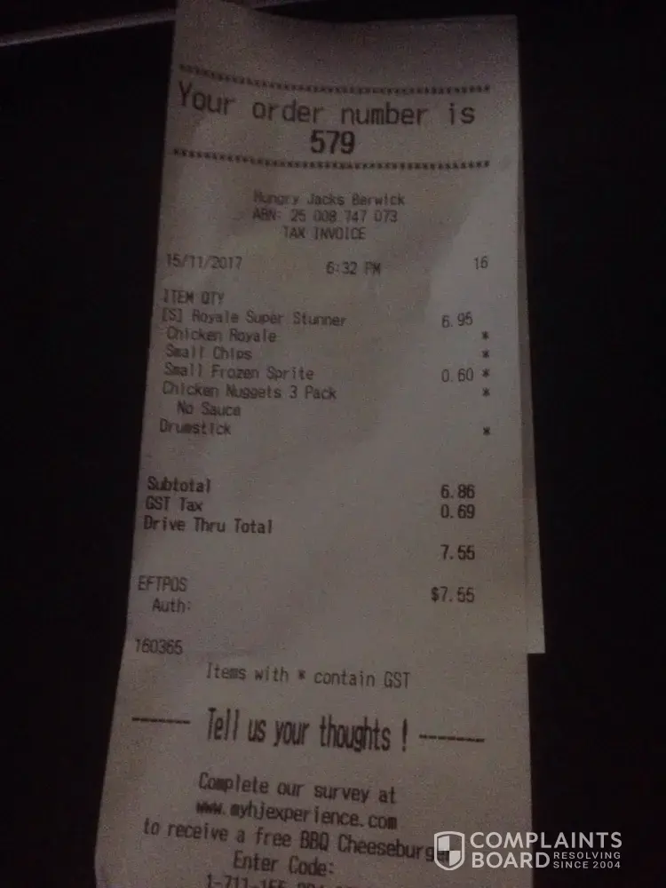 Ordered at 6.32pm, 15/11/17. Hungry jacks Berwick.