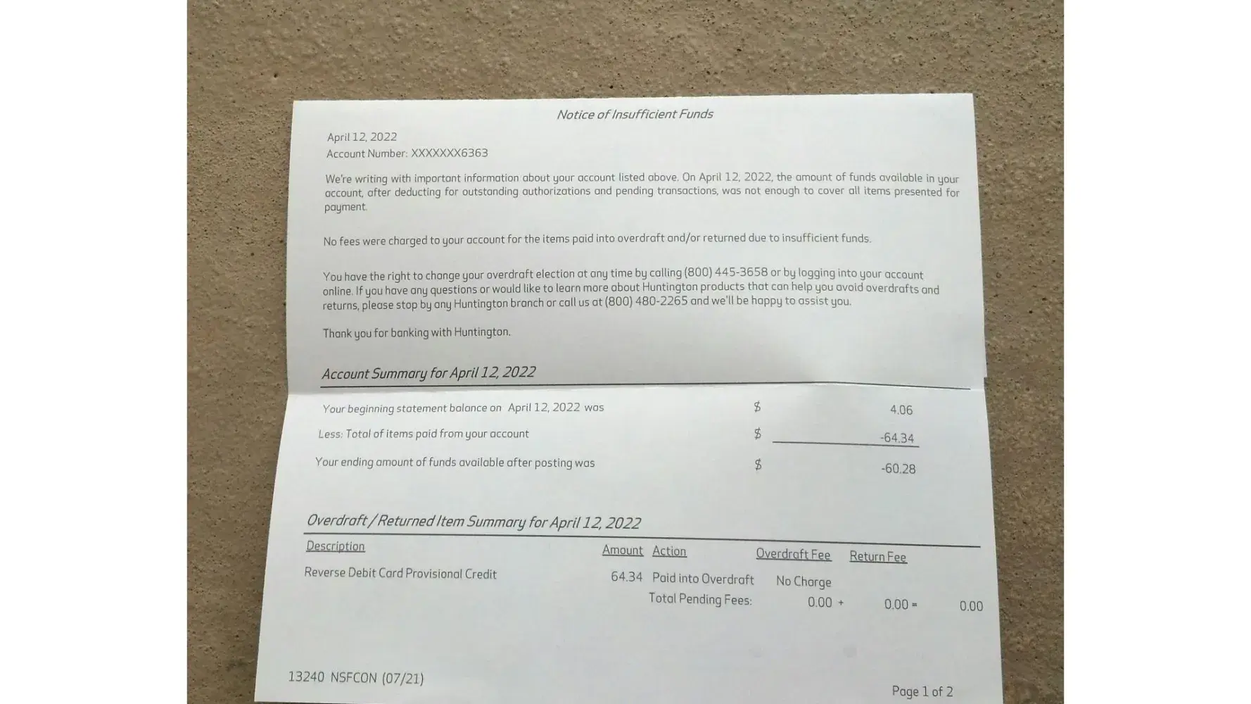 False overdraft of $64.34