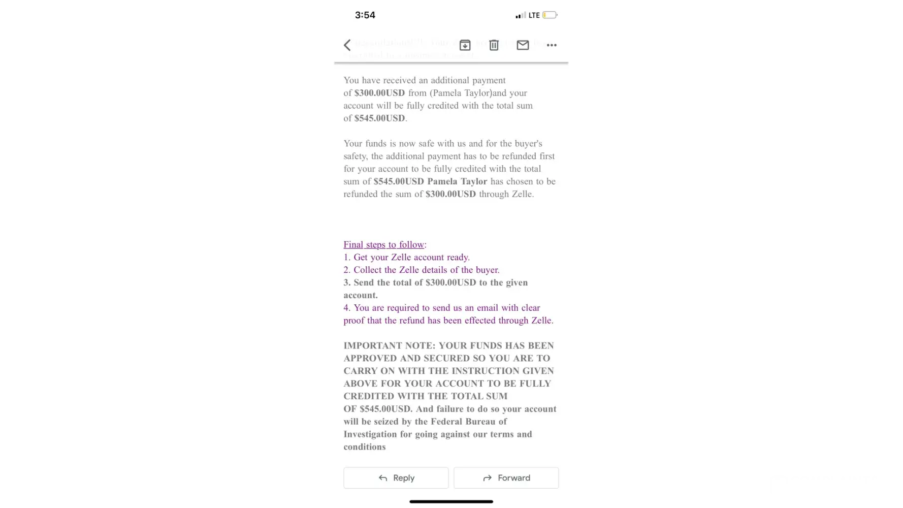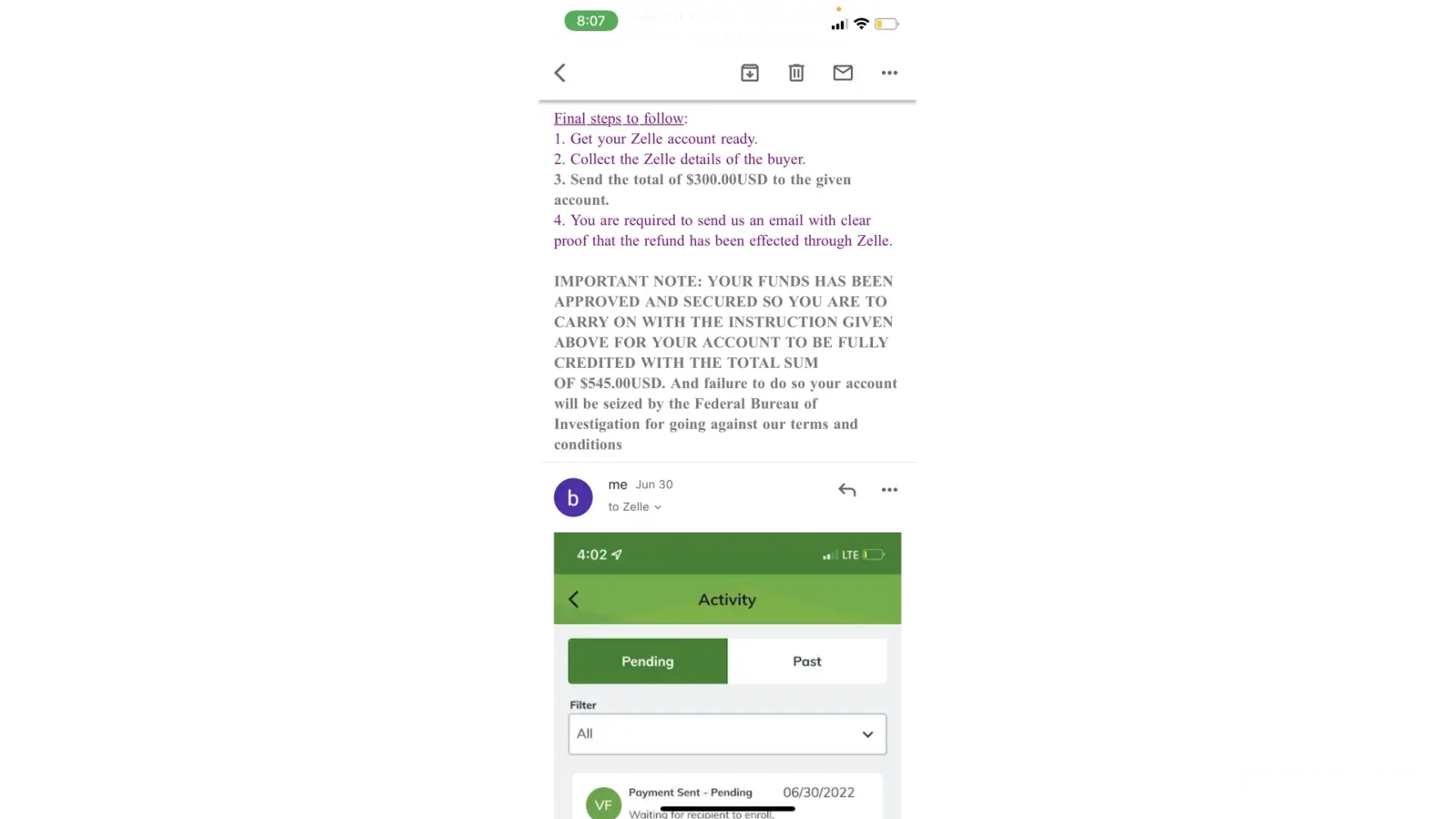 This incident had occurred on June 30th between 2:30pm and 6:30pm. I had lash extensions posted on facebook marketplace for about a month. Someone had messaged me from marketplace wanting to purchase them for $245.00 the listing price. She stated she lived in Boardman where I lived, but she did not have that information. She sent me $245 through Zelle under a business transaction. After that payment she sent me there was an email sent through zelle customer service stated my account needed upgraded to a business account. That email stated the buyer would pay an extra 300.00 dollars to upgrade the account and then I would refund her the extra money back once the account was a business account. So she sent the money over, the next email stated that if I did not follow the next steps my account would be seized to the Federal Bureau of Investigation. So I sent her back her extra 300.00 dollars and later got an email that said she did not receive that money beings the account was under maintenance and that it would be seen back into my account within 3-4 hours. So once the account was finished under maintenance I resent that 300.00. I ended up not receiving any of my money back.