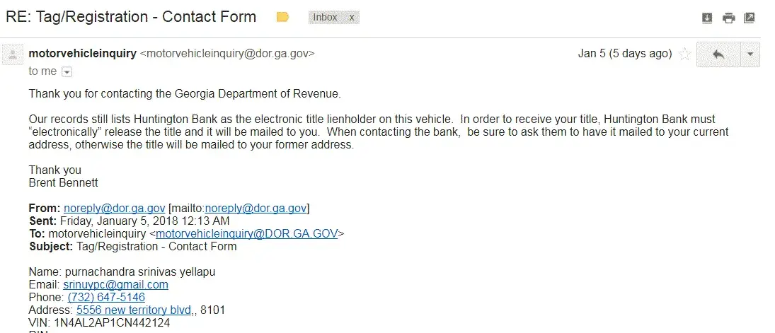 Since it is a electronic title Georgia tag office was unable to accept a paper Lien release. Please refer to the email note from Georgia tag office, also enclosing the emails communication for reference