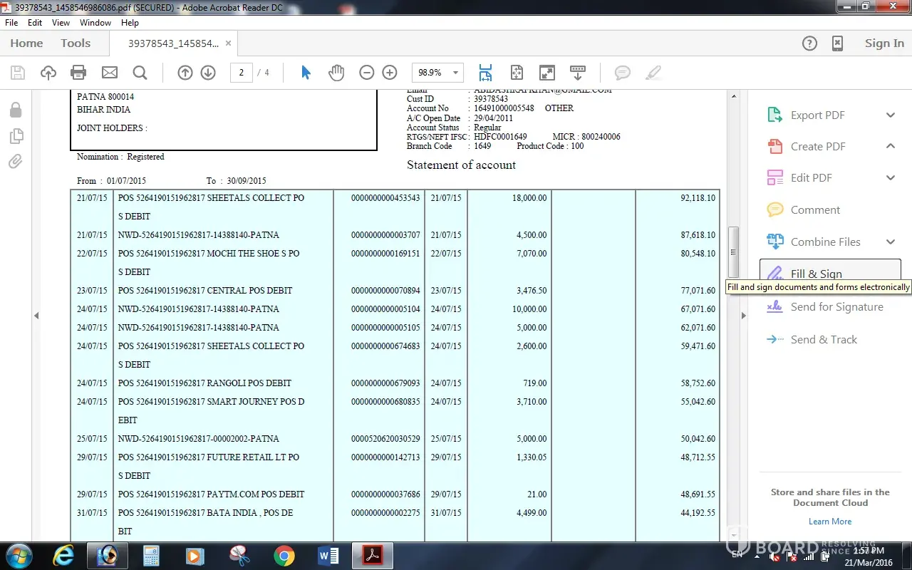 Cash memo – bill lost but attached here with the account statement of my account showing debiting Rs. 4499 in favor of BATA India dated 31st July 2015.