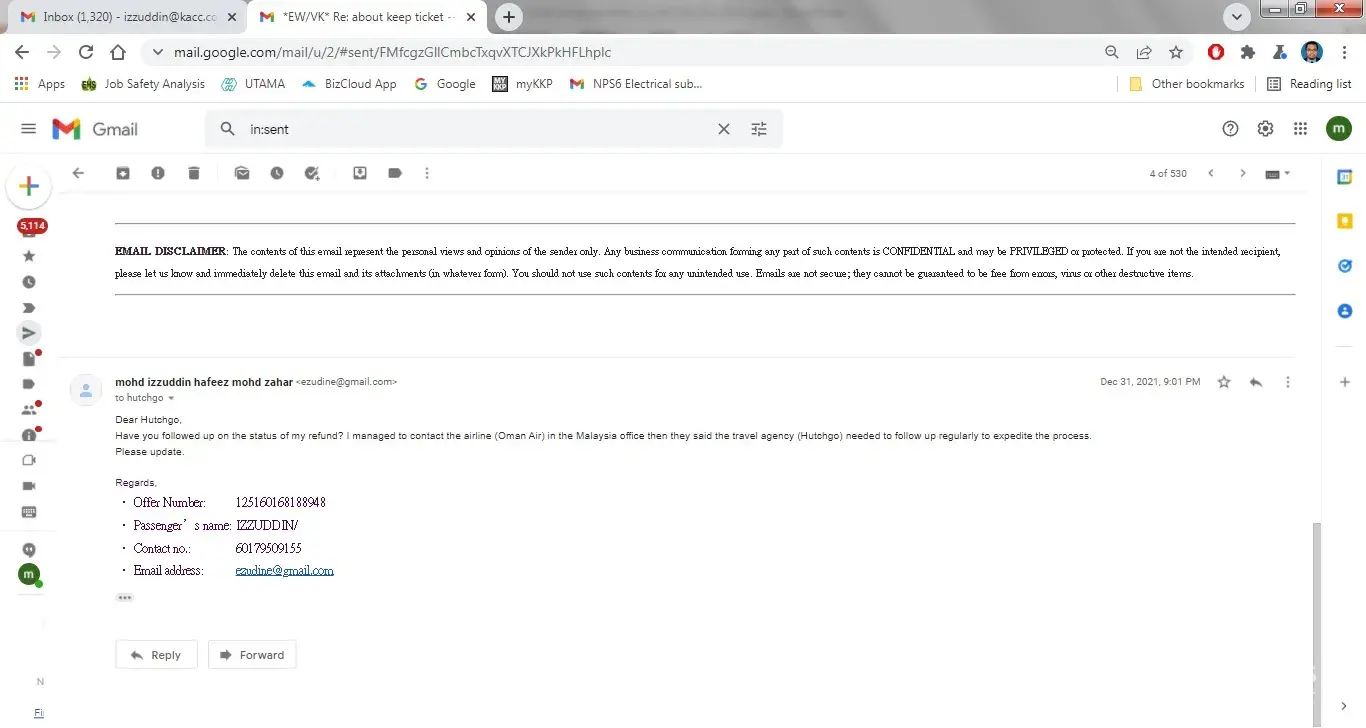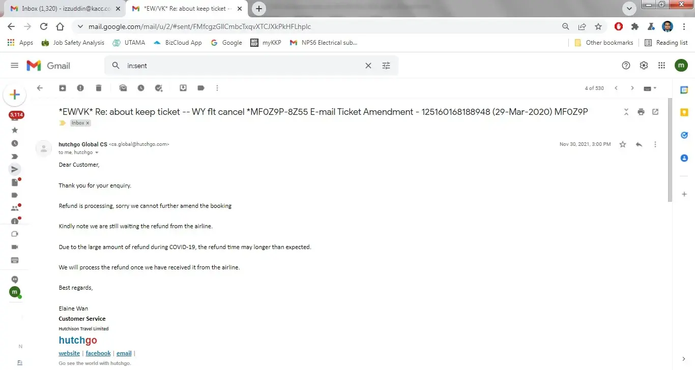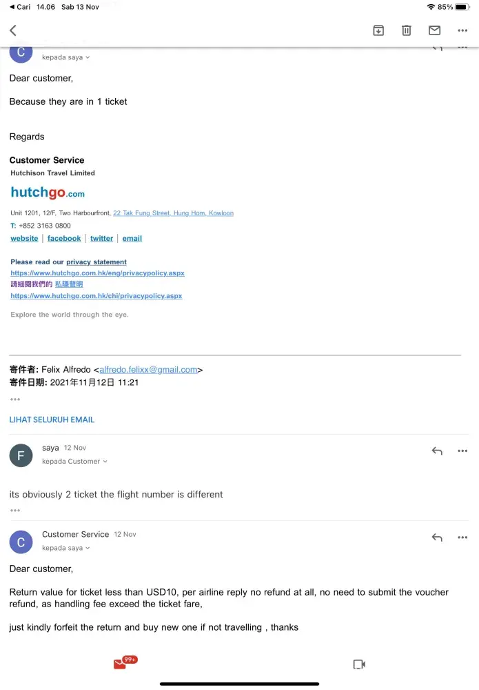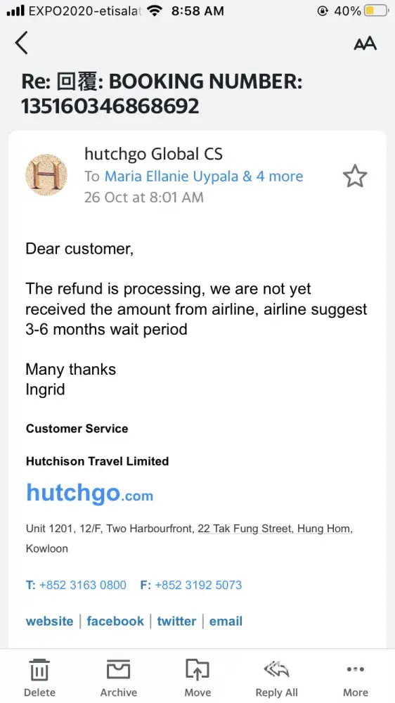 5. I have email asking (hutchgo.com) pertaining on the refund status and my inquiry request to convert the refund to Credit Note if possible, but (hutchgo.com) replied that the refund cannot be change and just wait for the refund to be bank in to my account when they received the refund amount from Oman Air. Please refer to appendix 4 on my inquiries and appendix 5 replied to an email from (hutchgo.com).