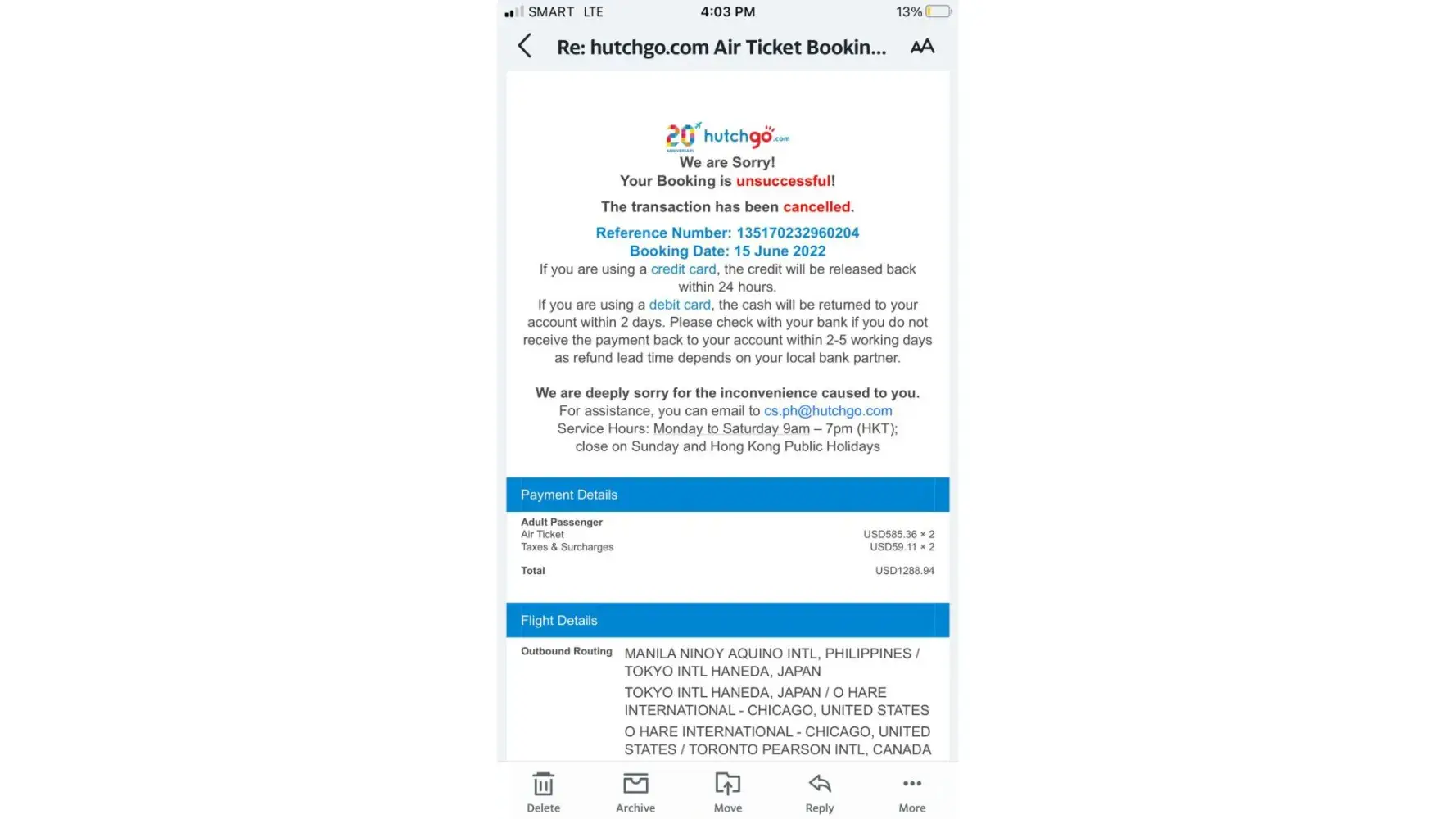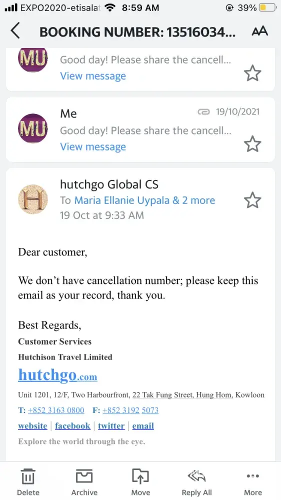 I have emailed hutchgo CS to cancel my booking, they agreed to process it for a cancelation fee and I agreed. It's better to get something than nothing. An agent sent me a screenshot about the refund and I've been following up ever since and nobody is responding to my emails and calls. My flight date was already over and I want to make sure that the refund was processed because I didn't even ride the plane for the reason that they might have canceled my ticket and I'll just waste my time and effort going to the airport. 2 weeks have passed and I'm still not getting any response! This company is very disappointing. They just stopped responding to emails and that's it.