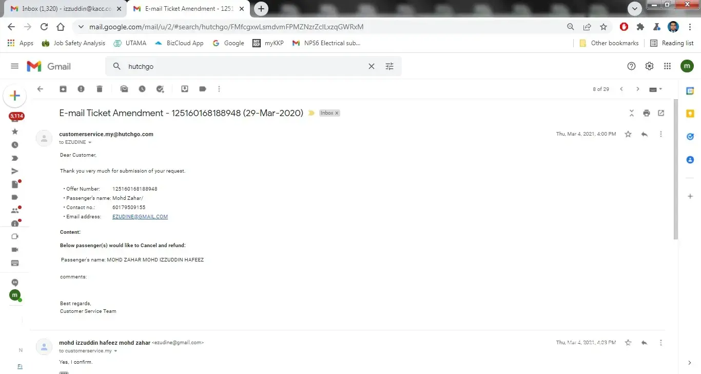 2. Due to the prolongation of travel restriction last year, I decided to cancel my flight ticket and request for a refund on 4th March 2021 by (hutchgo.com) and the process of refund was expected to take 3-6 months. Please refer to appendix 2 on the confirmation email sent by (hutchgo.com) customer service on ticket cancellation and refund request.