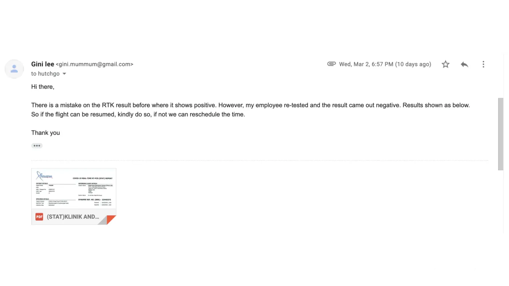 4) In the same time (2nd March), my employee did another test to see if its a false result but true enough, the result came out negative. So I've emailed over to hutchgo again on the updated result. And inform them that my employee is able to make it to the flight, and they replied: