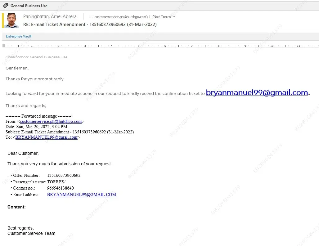Due to erroneous entry of email address provided and in which it was already amended until now the confirmation ticket has not been yet received in the amended email address provided ([protected]@gmail.com) with Booking Reference Number: [protected] under the name of Mr. Noel Torres (see attached email communication).