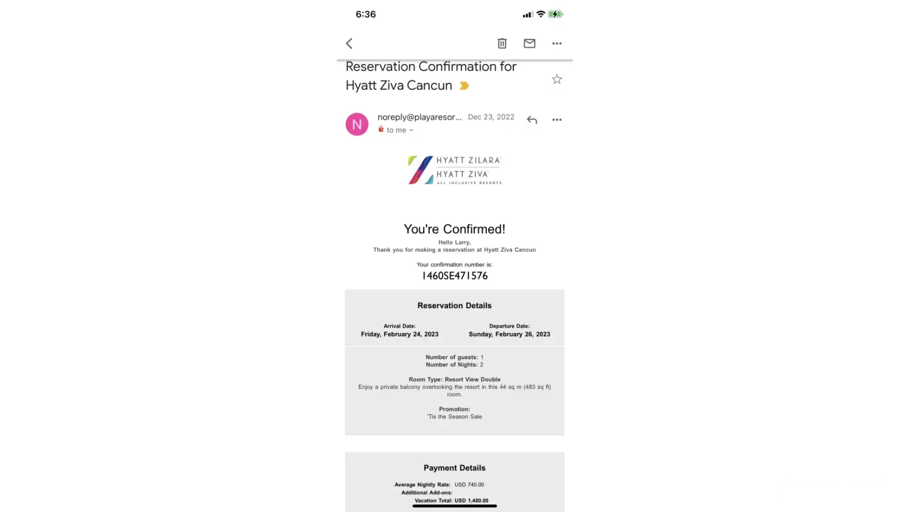 I made a reservation for 2/24/23 to 2/26/23 for my son's wedding at Hyatt Ziva Cancun Mexico I wasn't sure my passport would come in time so I cancelled my existing reservation before allowed time you had to cancelled or your stuck with the bill so working this out a new reservation with reservation clerk Erick Barcelo, we made a new reservation with same days which would allow time for my passport to come my first reservation cost was 1480.00 on my AMEX card which was cancelled my new reservation was for 1769.63 which I paid with my Visa on checkout day then o the 27th of February they charged me again 1480. on my AMEX the one I cancelled so I'm being charged twice on two cards I have tried to contact them over and over again every time I called; they would tell me somebody would call me within three days, but it never happens I sent numerous emails my also tried to contact them never no response but they will acknowledge my cancelled reservation I made but don't know why I was charged #1460se471576 this is my confirmation number on wrongful charge. Please do something their crooked" my name is Larry Simpson I'm sending copies of transactions in photos.