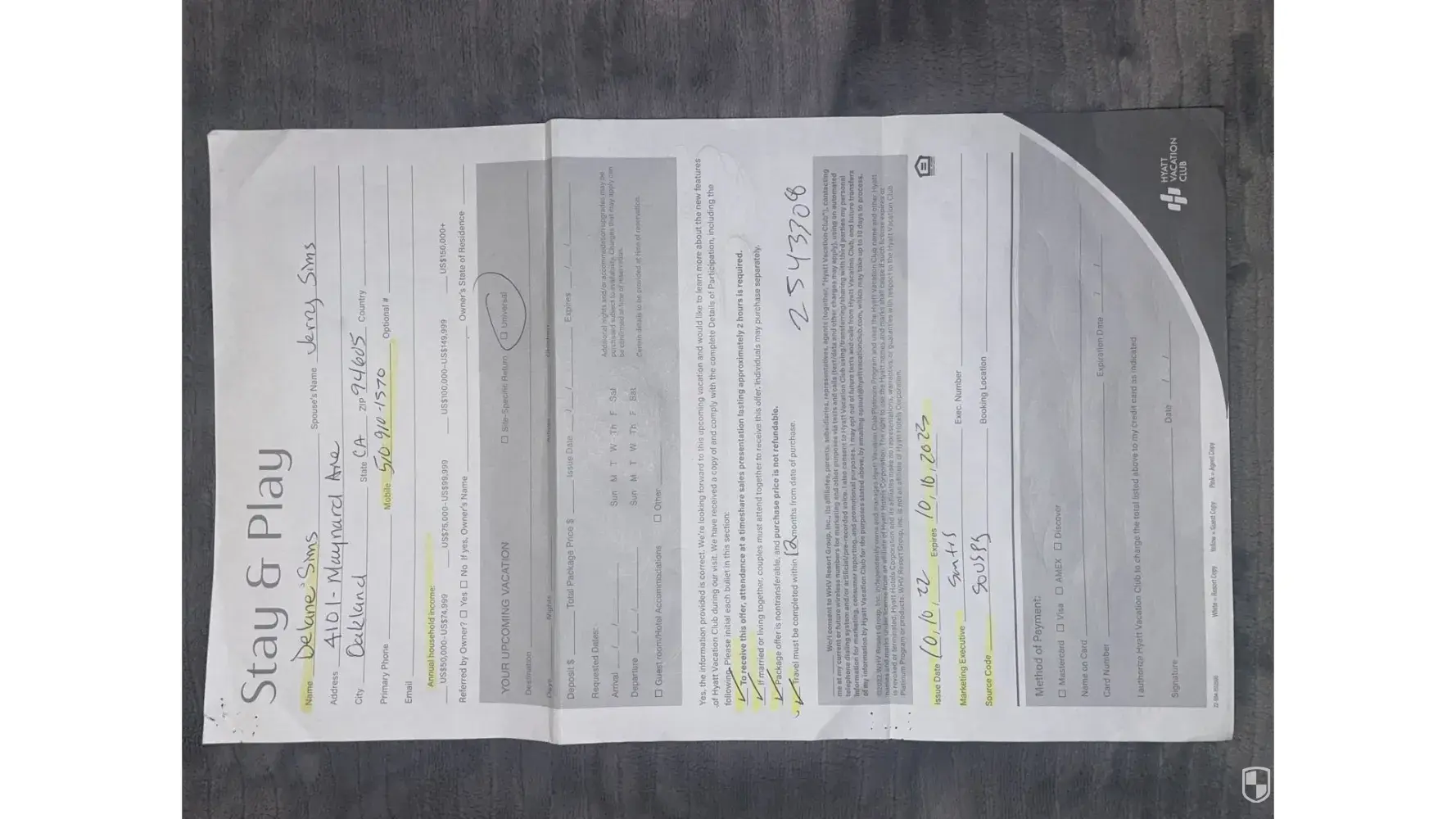 10/10/22 Jerry and Delane Sims attended time share presentation.